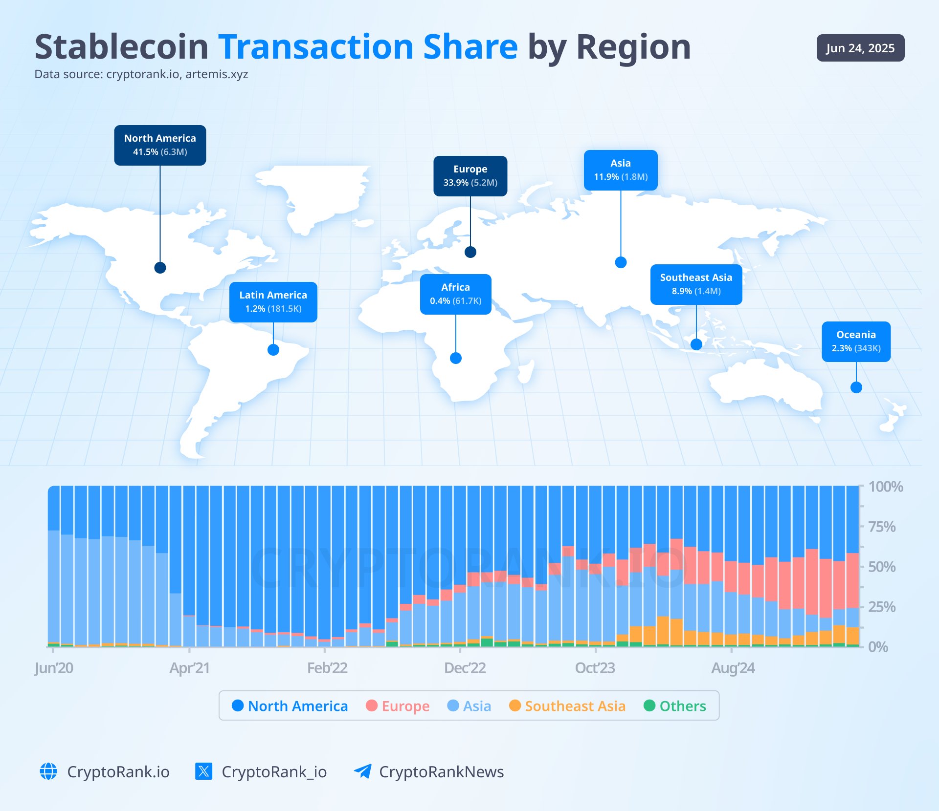 Bản đồ dưới đây tiết lộ thị phần giao dịch stablecoin toàn cầu tính đến 24/6/2025, và kết quả không quá bất ngờ: