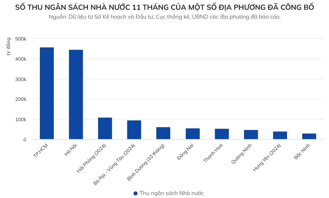 Thống kê từ các tỉnh, thành phố cho thấy bảng xếp hạng 10 địa phương dẫn đầu về thu ngân sách Nhà nước trong 11 tháng đầu năm đã có biến động ở hai vị trí đầu bảng. Nếu trong 10 tháng đầu năm, Hà Nội đứng đầu bảng về nộp ngân sách cao nhất cả nước thì tính tới cuối tháng 11, vị trí này đã thuộc về TP.HCM.