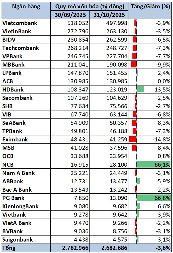 Theo thống kê từ 27 ngân hàng niêm yết, quy mô vốn hóa tính đến ngày 31/10/2025 chỉ còn hơn 2,68 triệu tỷ đồng, giảm 3,6% so với cuối tháng 9 – tương đương mức giảm tuyệt đối 100.280 tỷ đồng.