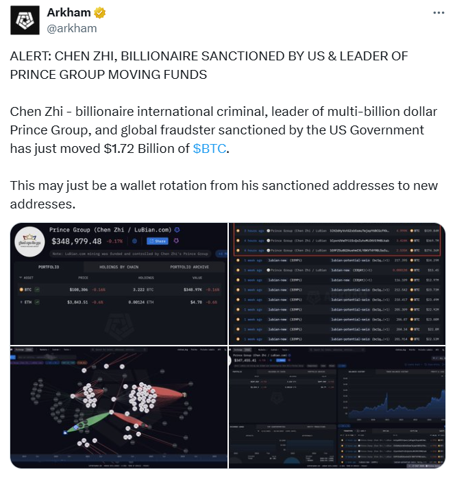 Theo dữ liệu từ Arkham Intelligence, 15.959 BTC (tương đương khoảng 1,72 tỷ USD) đã được di chuyển hôm 22/10, từ các địa chỉ ví liên quan tới Prince Holding Group – tập đoàn do Trần Chí sáng lập và hiện bị cáo buộc là trung tâm của một mạng lưới lừa đảo “pig butchering” toàn cầu, có dính líu tới lao động cưỡng bức.