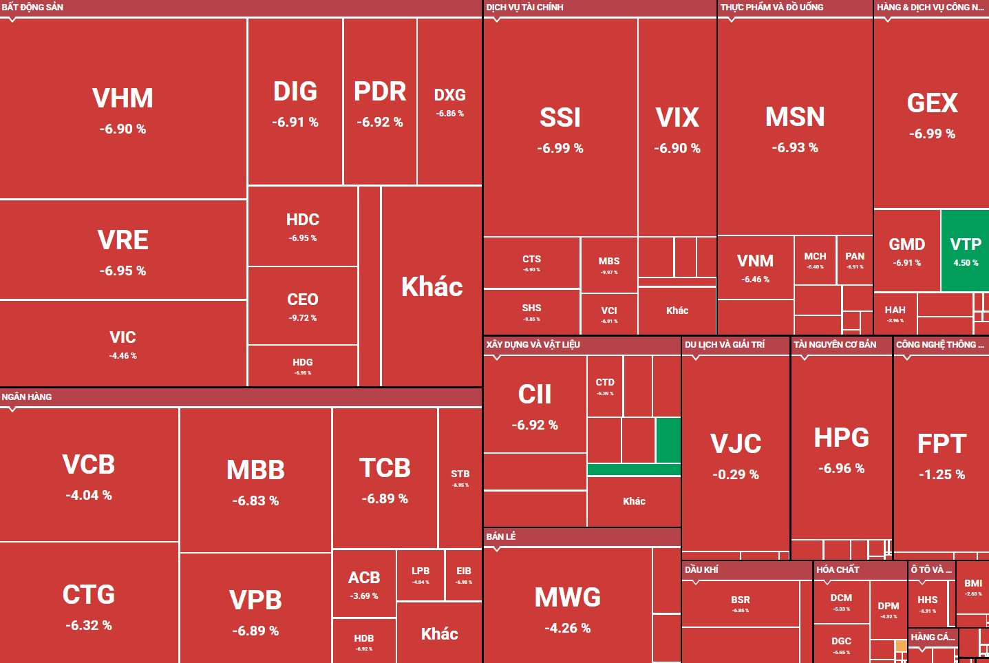 Tâm lý nhà đầu tư bị ảnh hưởng nặng nề. Hơn 320 mã giảm giá trên HOSE, trong đó cso tới 108 mã giảm kịch biên độ. Hàng loạt cổ phiếu trụ như HPG, SSI, VRE, MSN, TCB, VPB… nằm sàn.