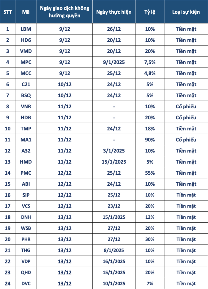 Ngày giao dịch không hưởng quyền là 12/12. Thời gian thanh toán dự kiến là 25/12.