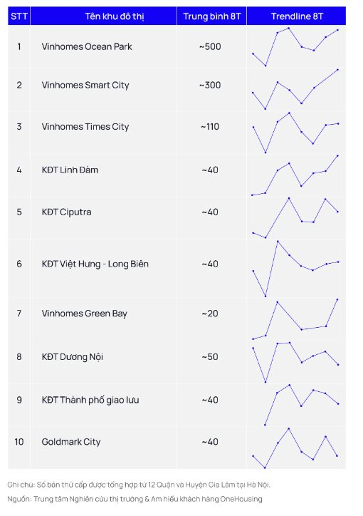 Trong đó, top 10 dự án có lượng chuyển nhượng cao nhất đạt khoảng 1.500 căn, chiếm 48% giao dịch chuyển nhượng. Các dự án này nằm chủ yếu tại khu Đông và khu Tây Hà Nội.