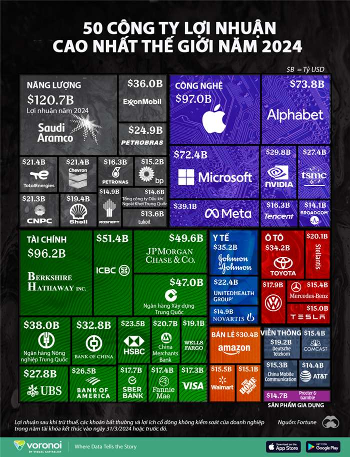Theo xếp hạng này, Saudi Aramco là công ty có lợi nhuận cao nhất thế giới năm 2024 với 120,7 tỷ USD. Đứng thứ hai là Apple với lợi nhuận 97 tỷ USD, chủ yếu đến từ iPhone và mảng dịch vụ. Công ty đầu tư Berkshire Hathaway của tỷ phú Warren Buffett đứng thứ ba với lợi nhuận 96,2 tỷ USD.