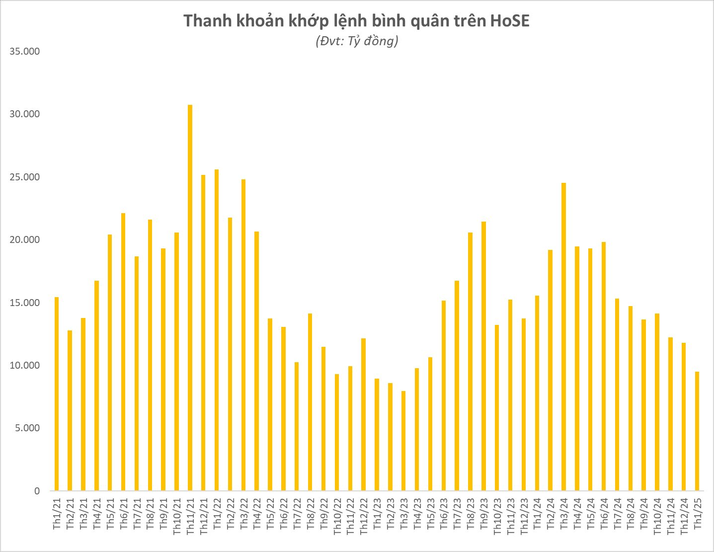 Trên thực tế, bối cảnh thị trường chứng khoán trong quý cuối năm 2024 tiếp tục ảm đạm. Thanh khoản khớp lệnh liên tục sụt giảm, bình quân xuống dưới 13.000 tỷ đồng/ phiên trên HoSE. Con số này tiếp tục giảm mạnh trong tháng đầu năm 2025 khi tâm lý nghỉ Tết bao trùm.