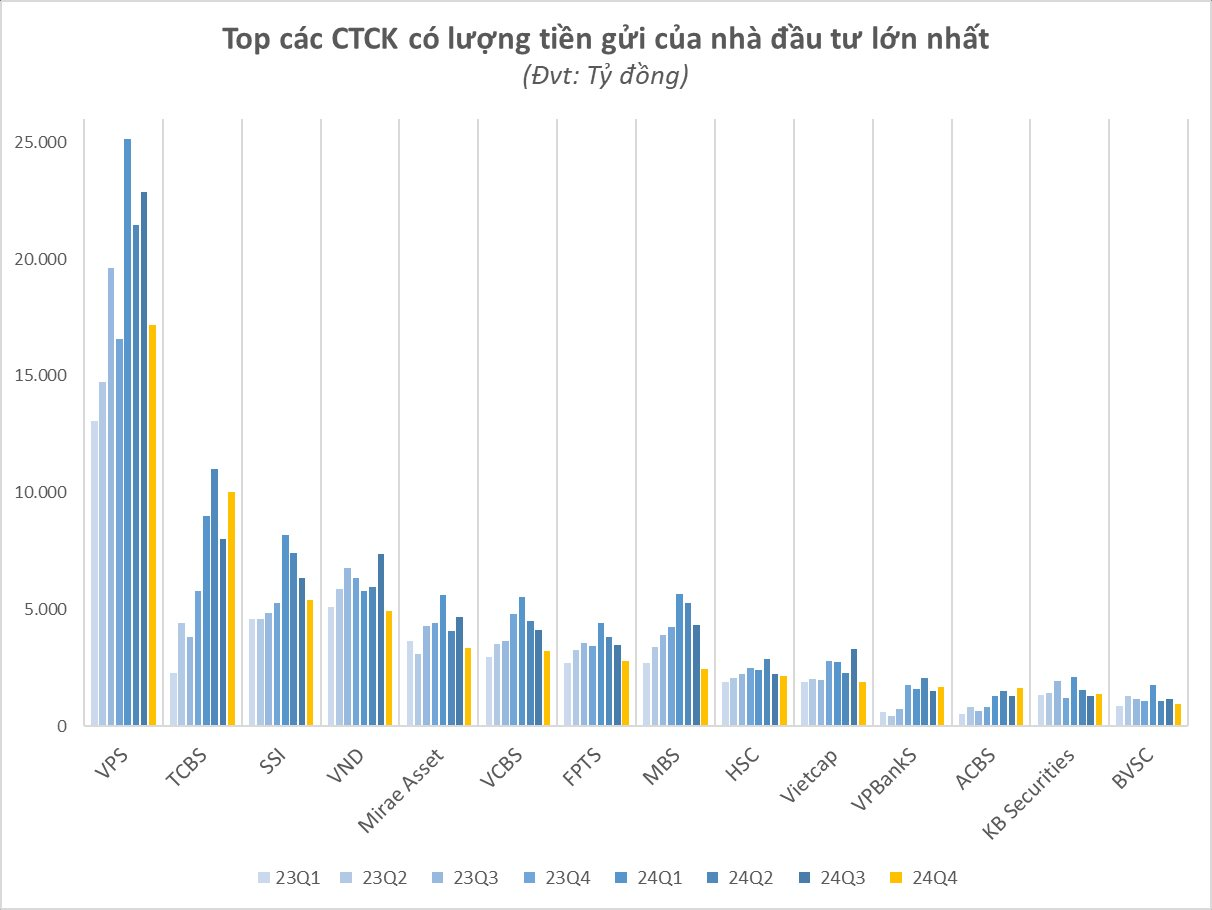 Theo số liệu thống kê từ báo cáo tài chính, số dư tiền gửi khách hàng tại các CTCK vào thời điểm cuối quý 4/2024 đạt khoảng 73.000 tỷ đồng. Đây chủ yếu là tiền gửi của nhà đầu tư giao dịch chứng khoán theo phương thức CTCK quản lý.
