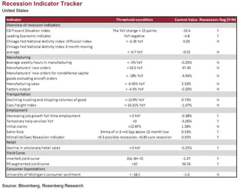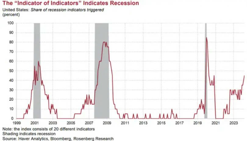 “Từ năm 1999, chưa có nền kinh tế nào tăng trưởng khi 45% dấu hiệu suy thoái được kích hoạt ”, ông Rosenberg nhấn mạnh.