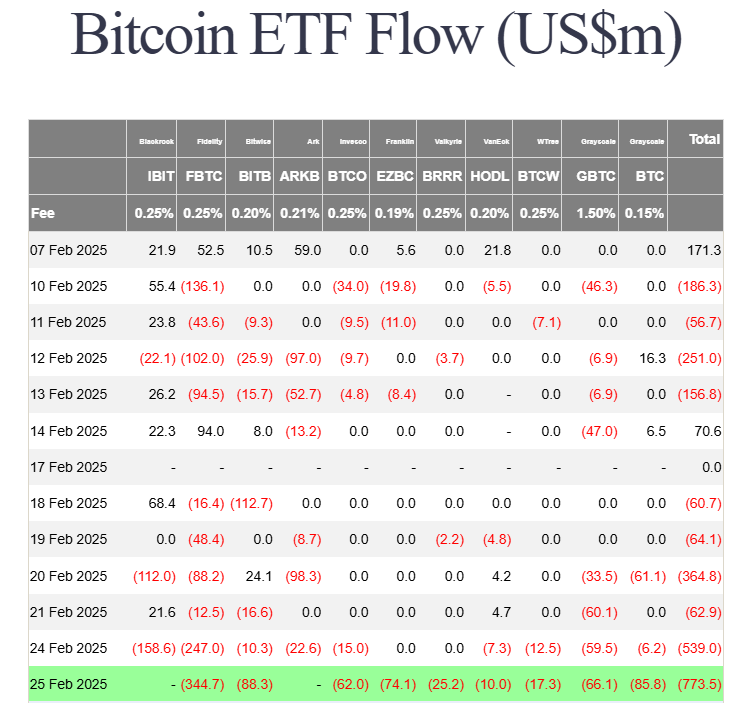 Dòng tiền tháo chạy khỏi các quỹ ETF Bitcoin giao ngay chạm mốc kỷ lục 935 triệu USD trong ngày 25/2, nâng tổng vốn rút ròng trong tuần chạm ngưỡng 1,5 tỷ USD.