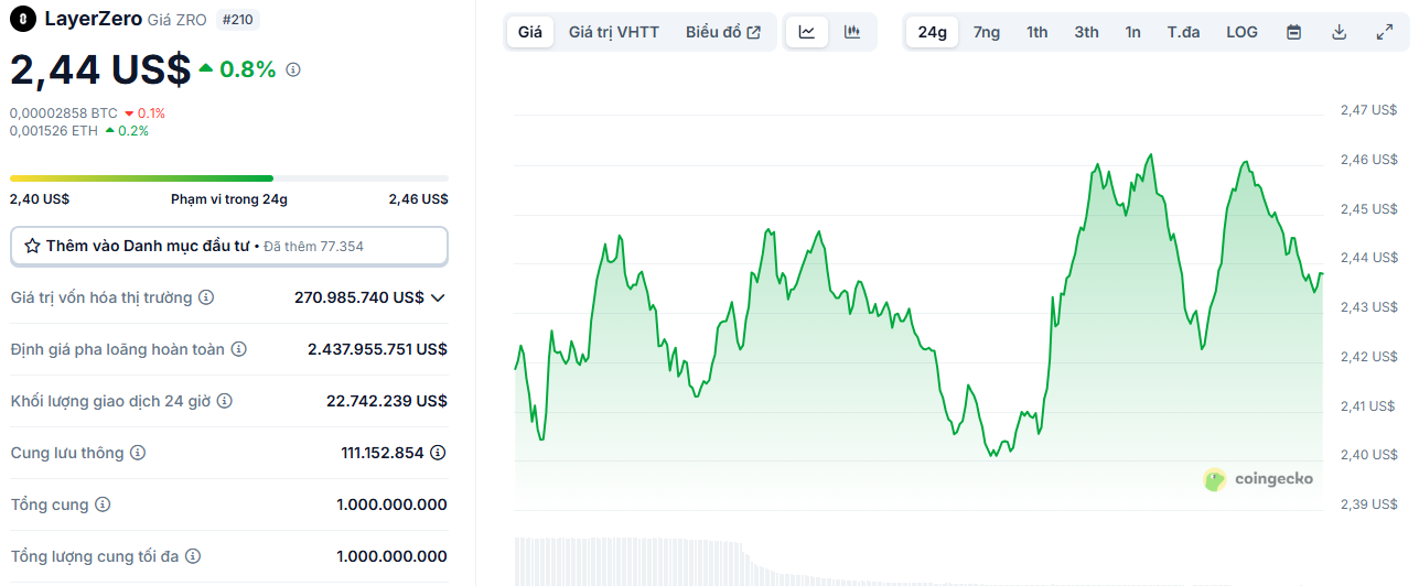 Giá ZRO tăng vọt lên 2,44 USD sau thông tin trên, vượt xa hiệu suất chung của thị trường crypto. Động thái này cho thấy sự lạc quan của nhà đầu tư, nhưng với số token bị khóa trong 3 năm, rõ ràng a16z đang đặt cược vào giá trị dài hạn thay vì những cú pump ngắn hạn.