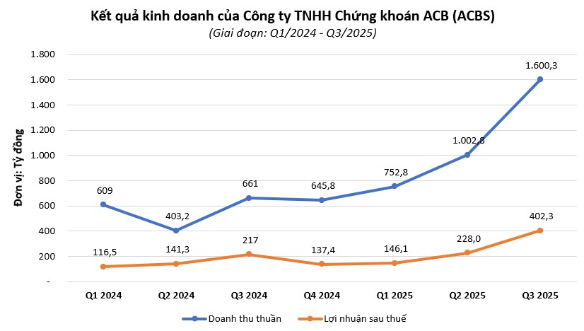 Cụ thể, trong quý 3/2025, Công ty TNHH Chứng khoán ACB (ACBS) ghi nhận lợi nhuận sau thuế đạt 402,3 tỷ đồng, tăng 85,5% so với cùng kỳ năm trước.