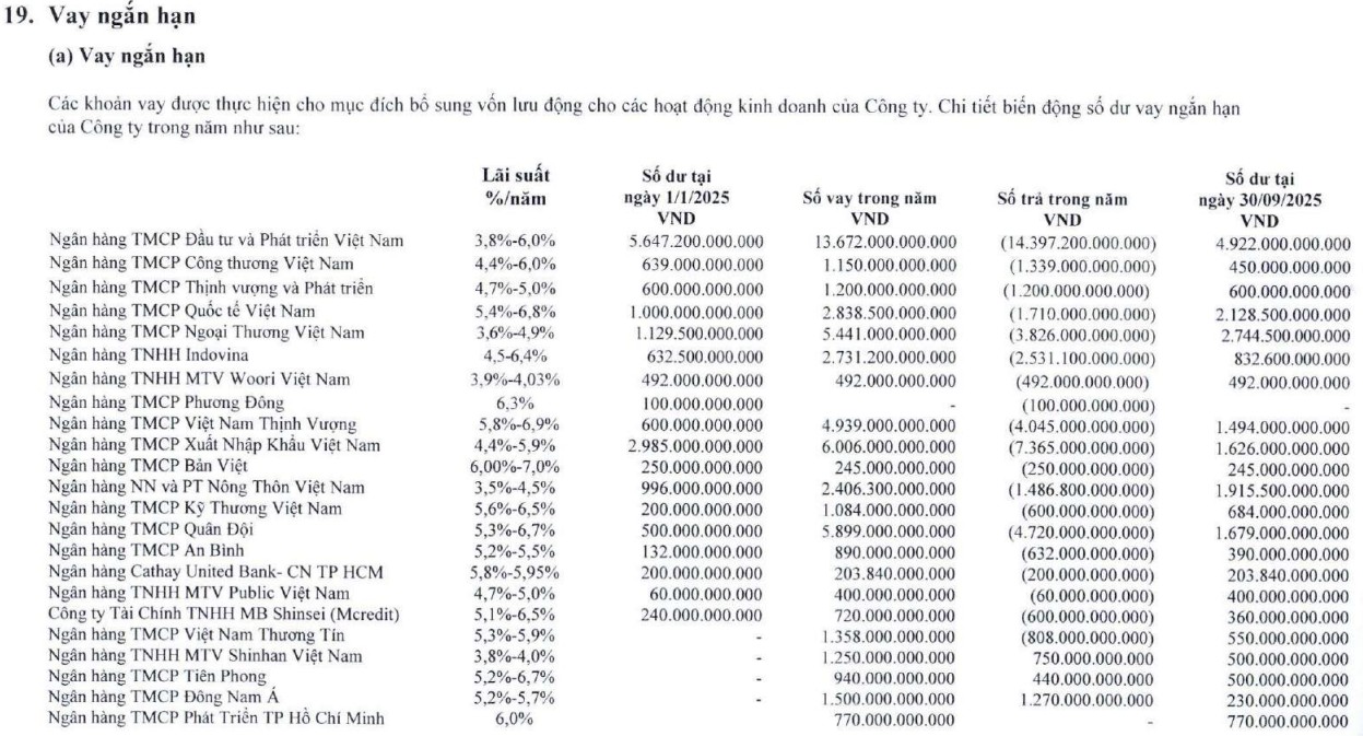 Tại ngày 30/9/2025, ACBS có hơn 15.360 tỷ đồng tiền gửi ngân hàng có kỳ hạn. Cùng thời điểm, dư nợ vay ngắn hạn của công ty đạt 24.466,9 tỷ đồng, tương đương gần 1 tỷ USD. Các khoản vay này có lãi suất tương đối “mềm”, dao động từ 3,5 - 7%/năm.