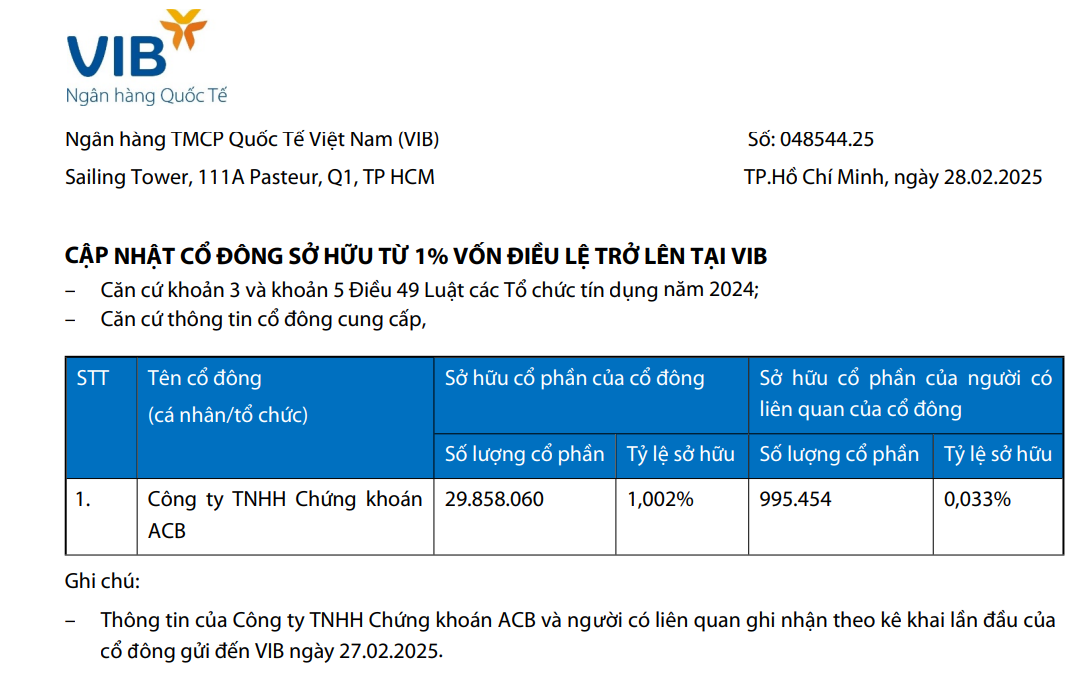 "Thông tin của Công ty TNHH Chứng khoán ACB và người có liên quan ghi nhận theo kê khai lần đầu của cổ đông gửi đến VIB ngày 27/02/2025", Ngân hàng TMCP Quốc tế Việt Nam (VIB) cho hay.