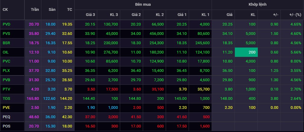 Nhóm cổ phiếu dầu khí đồng loạt tăng mạnh trong phiên giao dịch sáng nay (13/6): BSR, OIL, PLX, PTV, PVB, PVC, PVD, PVS.
