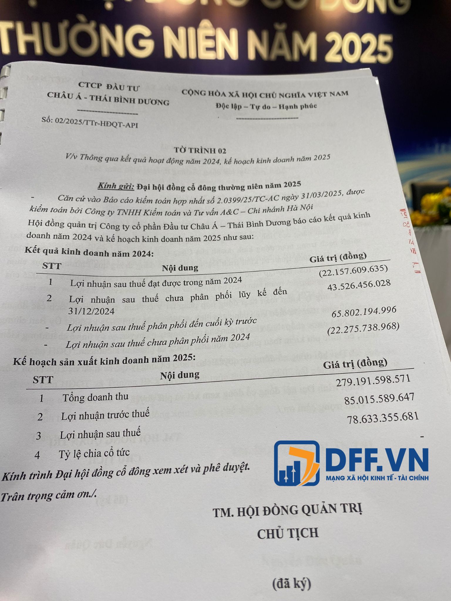 AGM 2025 của API đã thông qua kế hoạch kinh doanh năm nay với doanh thu đạt 279,1 tỷ đồng, lợi nhuận sau thuế đạt 78,6 tỷ đồng.