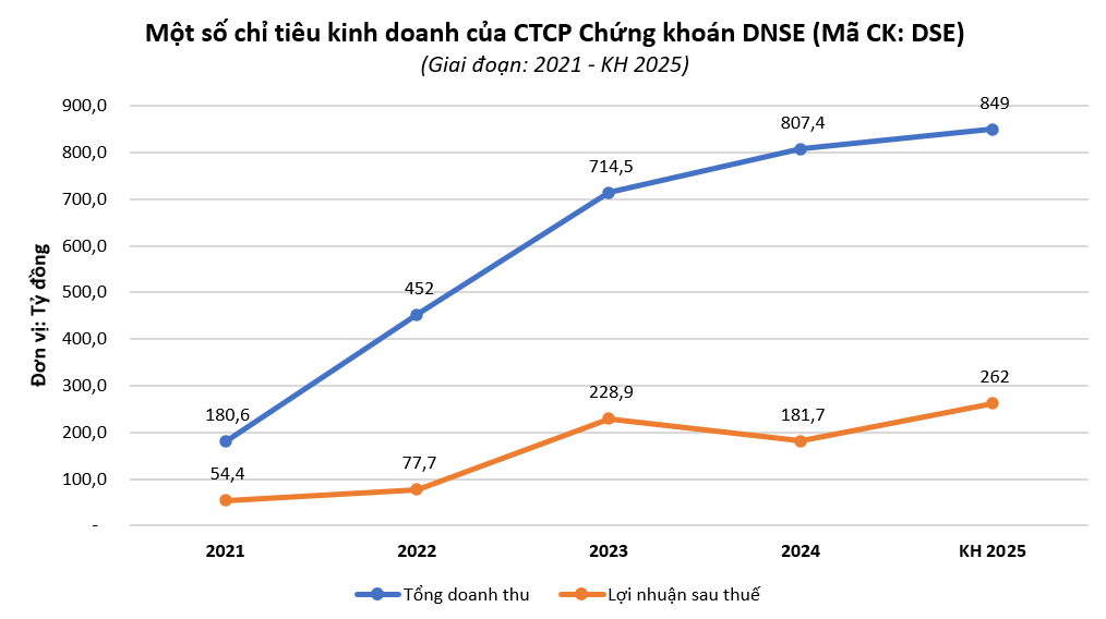 Năm 2025, ban lãnh đạo DNSE lên kế hoạch tổng doanh thu hoạt động đạt 849 tỷ đồng, lợi nhuận sau thuế ở mức 262 tỷ đồng, lần lượt tăng trưởng 5,2% và 44% so với thực hiện năm 2024.
