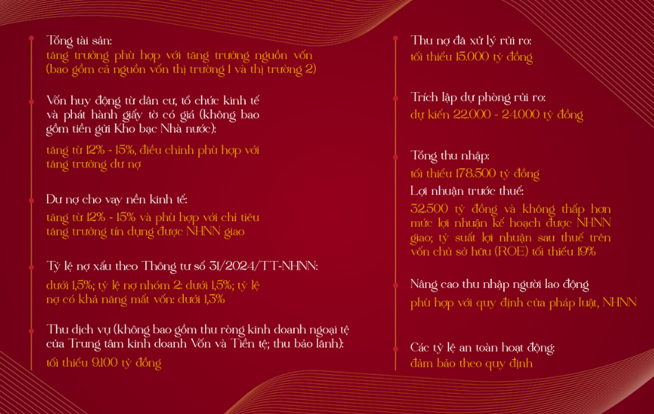 Ngân hàng đặt mục tiêu kiểm soát tỷ lệ nợ xấu theo Thông tư 31/2024/TT-NHNN dưới 1,5%; nợ nhóm 2 dưới 1,5% và nợ có khả năng mất vốn dưới 1,3%.