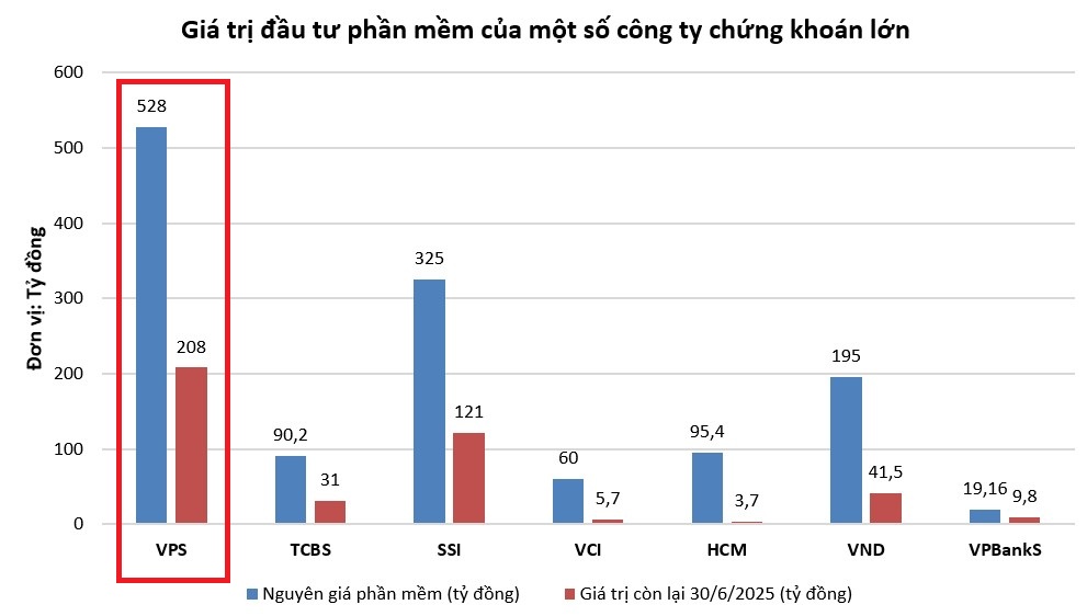 Tính đến cuối quý 2/2025, nguyên giá đầu tư phần mềm của VPS đạt 528 tỷ đồng, trong đó giá trị chưa khấu hao còn lại là 208 tỷ đồng – cao hơn nhiều so với các công ty chứng khoán khác, phản ánh lợi thế công nghệ vượt trội của VPS.