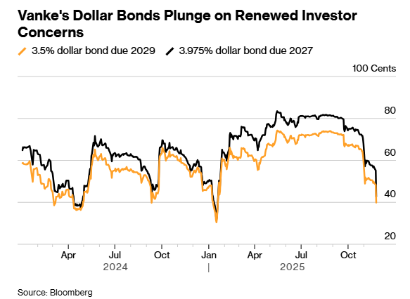 Trái phiếu USD đáo hạn năm 2027 của Vanke rớt xuống khoảng 40 cent mỗi USD mệnh giá, phản ánh mức độ căng thẳng tài chính đáng báo động (Nguồn: Bloomberg)