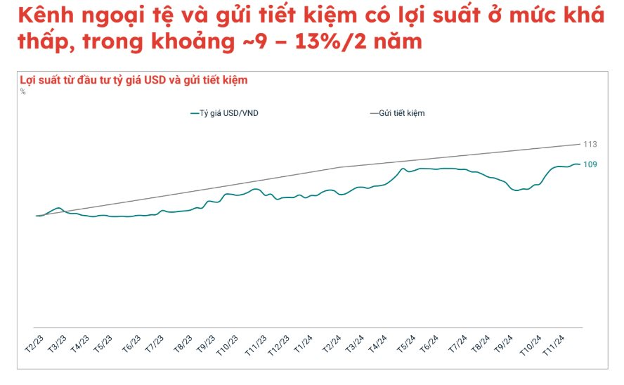Kênh ngoại tệ, chuyên gia tính toán mức sinh lời từ đầu năm 2023 tới cuối tháng 11/2024 đạt khoảng 13%, còn gửi tiết kiệm đạt khoảng 9%, an toàn nhưng không sinh lời nhiều.