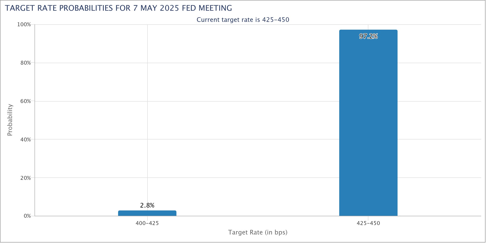 Dự đoán lãi suất mục tiêu Fed trong cuộc họp FOMC ngày 7/5 (Nguồn: CME Group)