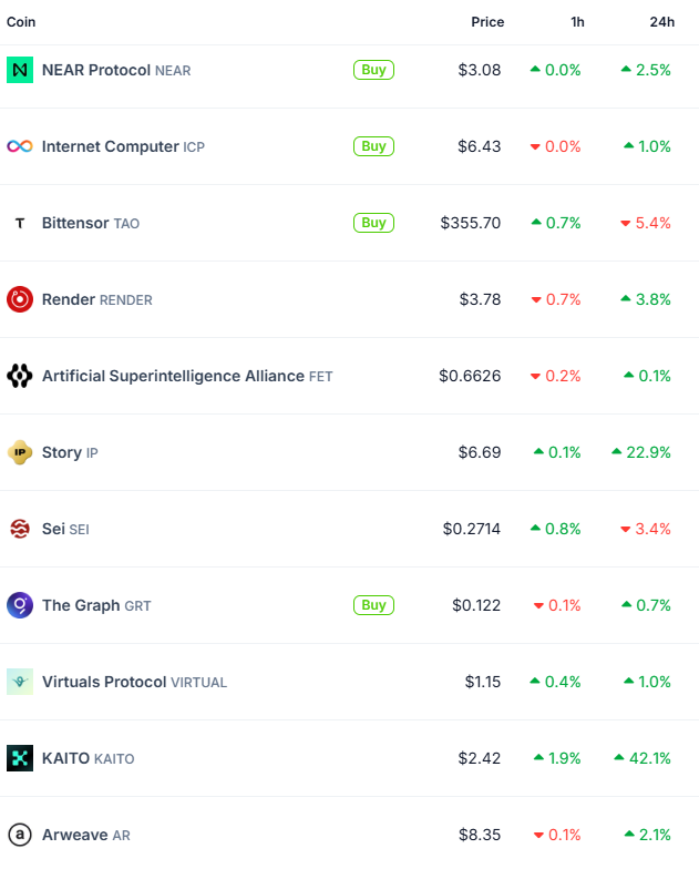 Ấn tượng nhất là KAITO với bước nhảy vọt 43%. Theo sau đó là IP (24%), cùng hàng loạt các token khác như RENDER, FET, và ICP.