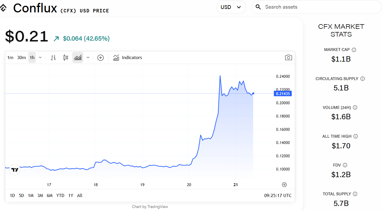 Giá token $CFX của Conflux đã tăng vọt 43% trong 24 giờ qua, đạt mức 0,21 USD, với vốn hóa thị trường hiện ở mức 1,1 tỷ USD, theo trang dữ liệu giá của The Block.
