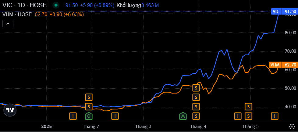 Nếu xét từ đầu năm tới nay, VIC và VHM thể hiện hiệu suất đáng nể khi đã tăng lần lượt 125,7% và 57,2%.