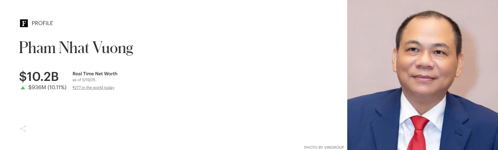 Theo dữ liệu của Forbes, cập nhật đến 10h ngày 20/5, ông Phạm Nhật Vượng đang sở hữu khối tài sản trị giá 10,2 tỷ USD, đứng thứ 277 trong bảng xếp hạng những người giàu nhất hành tinh - tăng 75 bậc chỉ trong vòng 2 tuần.