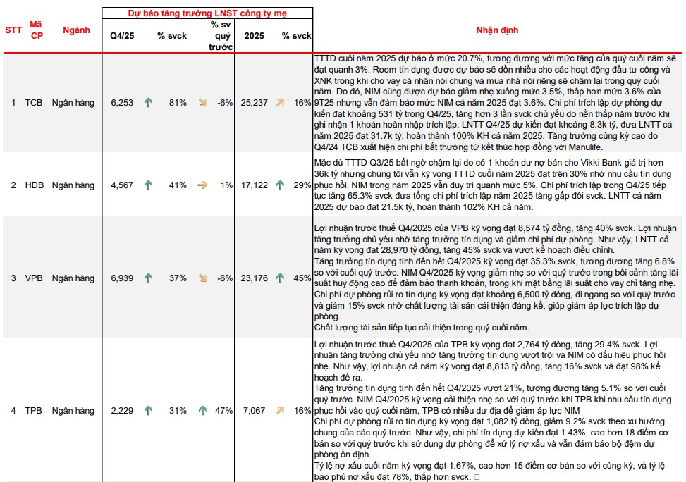 Đối với VPBank, lợi nhuận trước thuế quý 4/2025 dự báo đạt 8.574 tỷ đồng, tăng 40% so với cùng kỳ, nhờ tăng trưởng tín dụng mạnh và chi phí dự phòng giảm. Tăng trưởng tín dụng cả năm được kỳ vọng đạt 35,3%, trong khi lợi nhuận trước thuế cả năm 2025 ước đạt 28.970 tỷ đồng, tăng 45% và vượt kế hoạch điều chỉnh.