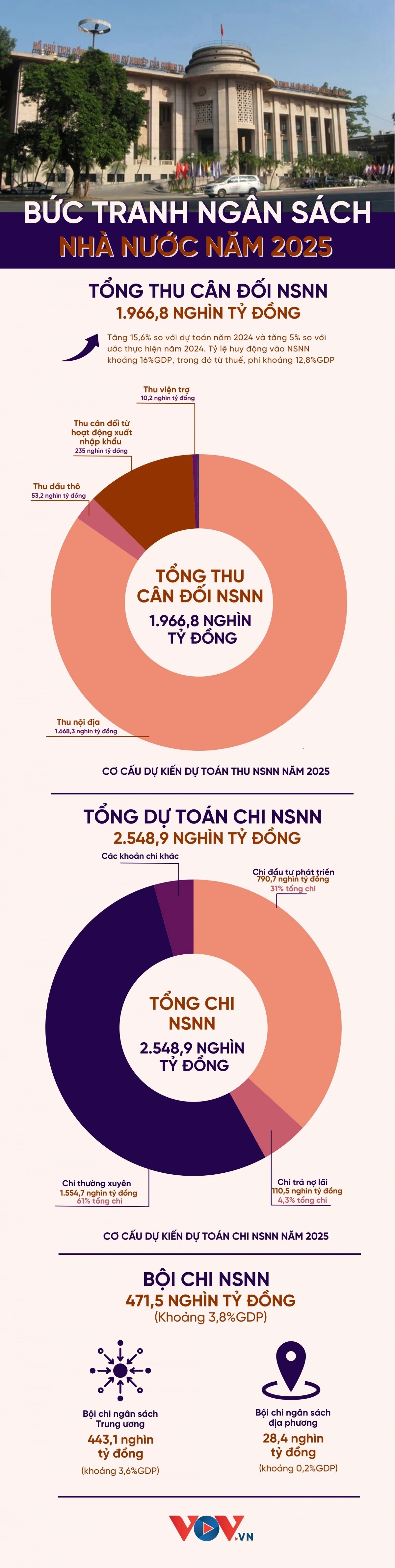 Bộ Tài chính vừa công khai số liệu dự toán ngân sách nhà nước năm 2025. Theo đó, dự toán tổng thu cân đối ngân sách nhà nước năm 2025 là 1.966,8 tỷ đồng; tổng chi NSNN là 2.548,9 tỷ đồng. Bội chi NSNN khoảng 3,6% GDP.