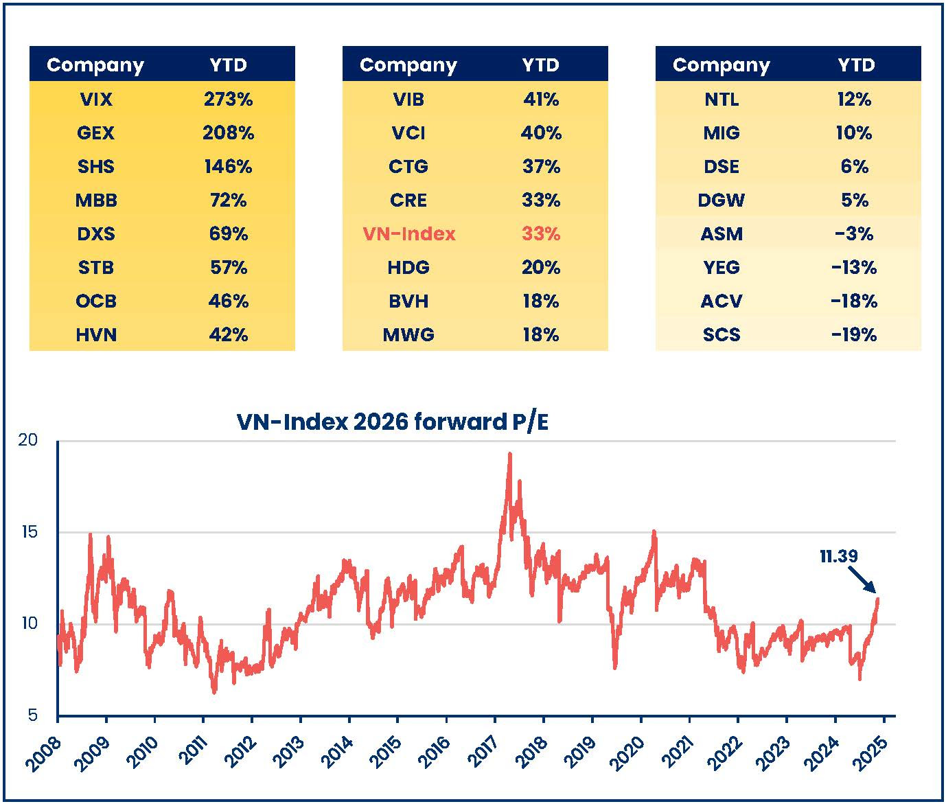 Tính đến cuối tháng 7/2025, Pyn Elite Fund quản lý danh mục trị giá hơn 912,5 triệu EUR (~ 27.000 tỷ đồng, tương đương 1 tỷ USD), với 31 mã cổ phiếu. Trong đó, nhiều cổ phiếu trong danh mục tăng trưởng vượt trội so với VN-Index (tăng 33% tính đến 21/8); một số mã thậm chí tăng bằng lần, như VIX, GEX và SHS.