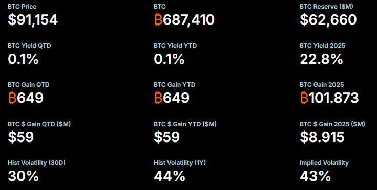 Cụ thể, lô BTC mới nhất được mua với giá trung bình 91.519 USD/BTC, cao hơn đáng kể so với giá vốn bình quân toàn bộ danh mục là 75.353 USD/BTC.