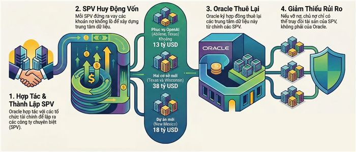 Trong mọi trường hợp, Oracle ký hợp đồng thuê lại các cơ sở này từ SPV. Nếu xảy ra tình trạng vỡ nợ, quyền thu hồi sẽ thuộc về các chủ nợ đối với tài sản của SPV – bao gồm trung tâm dữ liệu, đất đai và chip xử lý – thay vì trực tiếp với Oracle hay các công ty quản lý dự án.