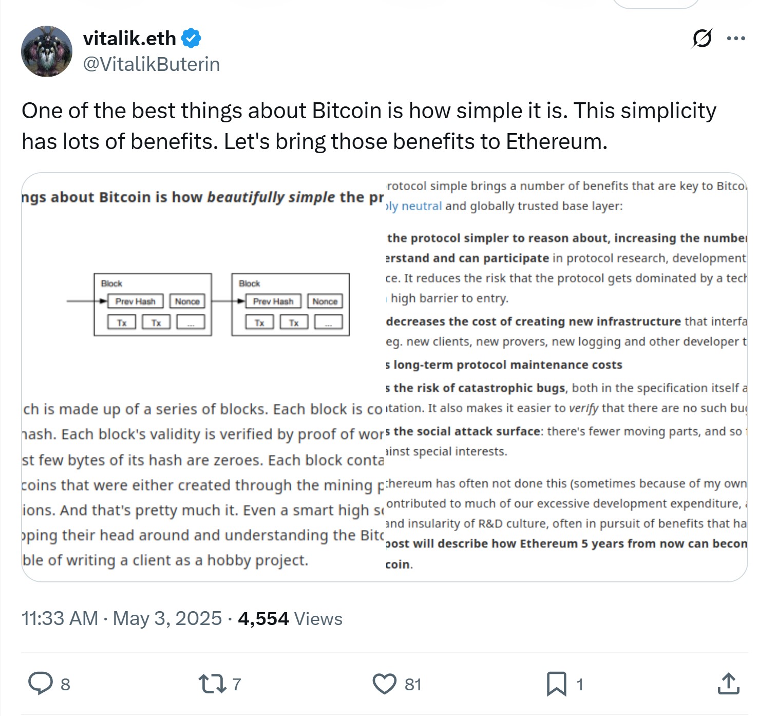Sau gần một thập kỷ phát triển với hàng tá bản cập nhật phức tạp, "cha đẻ" Ethereum - Vitalik Buterin - đang muốn "bẻ lái": Làm cho Ethereum đơn giản như… Bitcoin.