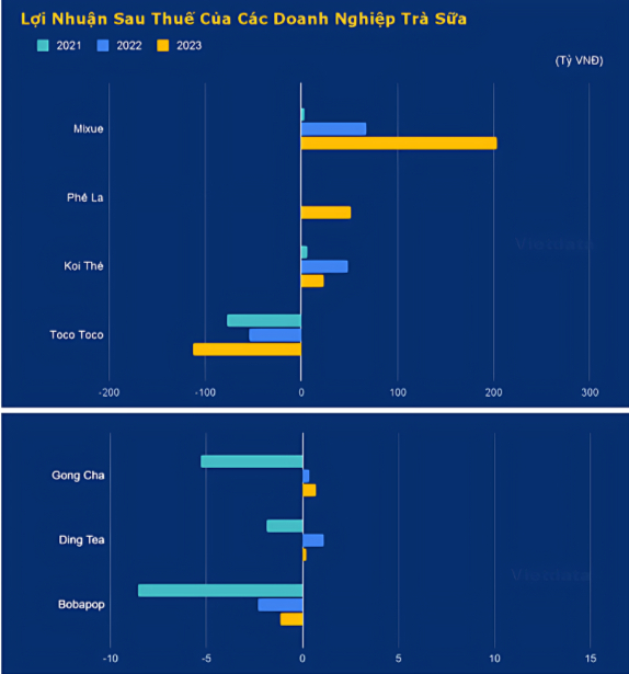 Lợi nhuận sau thuế của các doanh nghiệp trà sữa tại Việt Nam giai đoạn 2021 - 2023 (Nguồn: VietData)