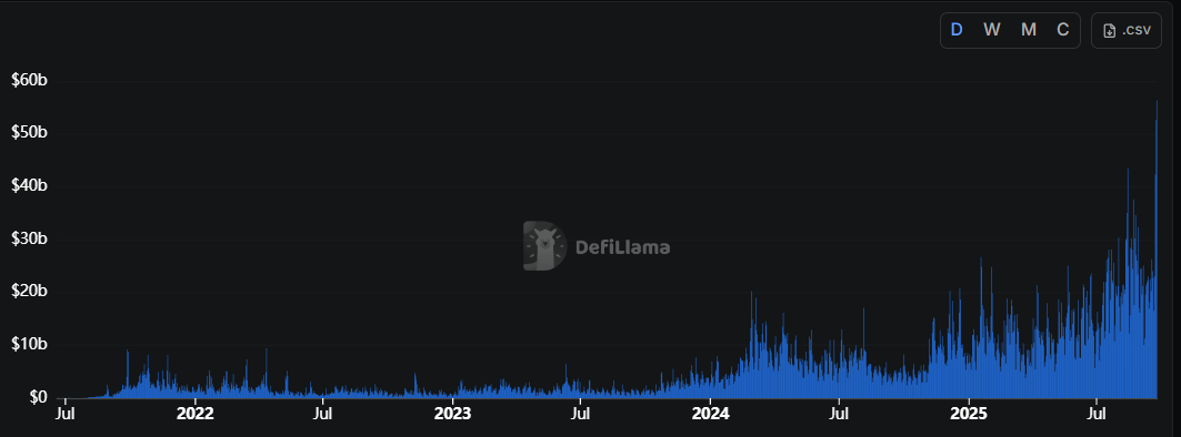Theo dữ liệu từ DeFillama, khối lượng giao dịch hàng ngày trên các Perp DEX đã vượt mốc 52 tỷ USD, tăng vọt 675% kể từ đầu năm 2025.