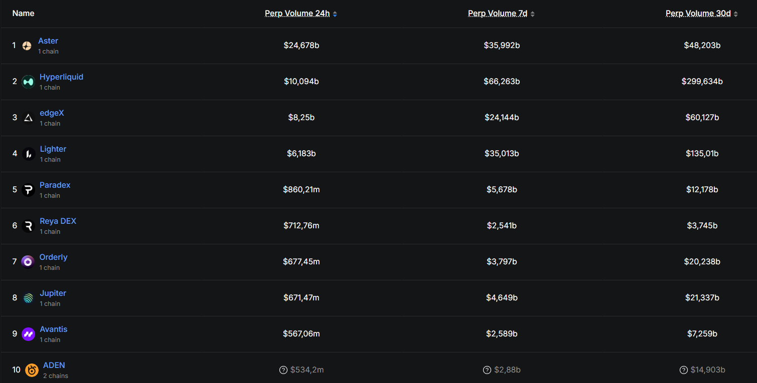 Còn Aster đã bứt phá ngoạn mục, tăng thị phần hơn năm lần từ 4,3% lên 24,3%. Sự hậu thuẫn từ CZ cùng với giá token $ASTER liên tục lập đỉnh mới, đã tạo nên sức hút mãnh liệt, không chỉ cho Aster mà còn cho toàn bộ mảng Perp DEX.