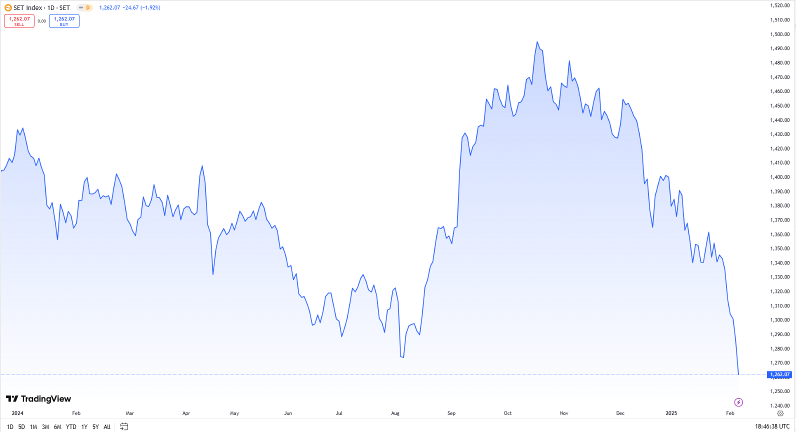 Thị trường chứng khoán Thái Lan tiếp tục chuỗi ngày ảm đạm khi chỉ số SET Index giảm gần 15% trong tháng 1/2025, nâng tổng mức sụt giảm từ đỉnh gần nhất (tháng 9/2024) lên 28%.