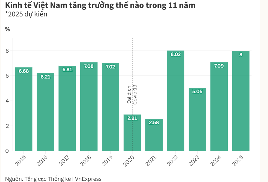 Thay vì mục tiêu GDP tăng 6,5-7%, kinh tế năm 2025 được Chính phủ đề xuất điều chỉnh lên trên 8%, làm tiền đề cho kinh tế tăng hai chữ số từ 2026, đưa đất nước vào kỷ nguyên phát triển thịnh vượng.