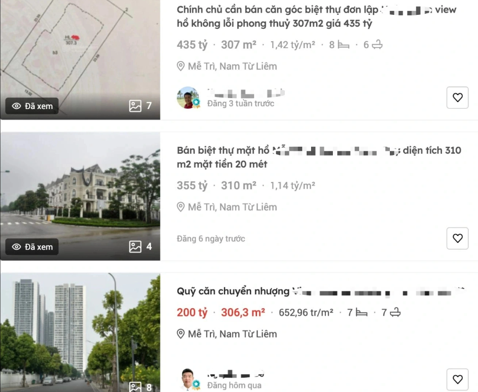 Cụ thể, một căn biệt thự đơn lập có diện tích 307m2 thuộc một dự án trên địa bàn quận Nam Từ Liêm đang được rao bán với giá 435 tỷ đồng, tương đương 1,42 tỷ đồng/m2.