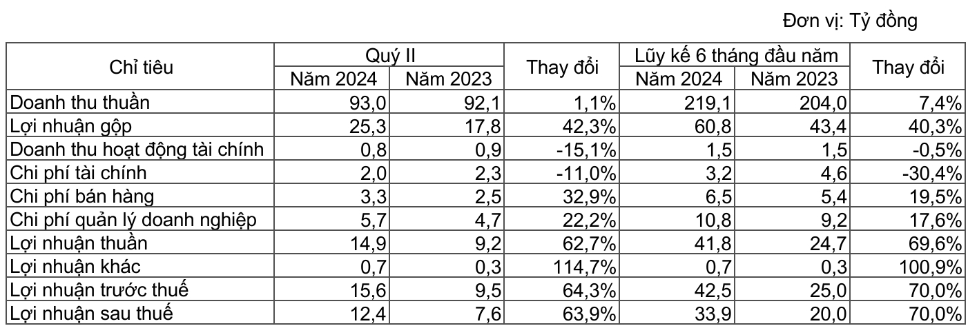 Theo báo cáo tài chính bán niên năm 2024 của PHN, doanh thu trong 6 tháng đầu năm của doanh nghiệp tăng 7,4%, đạt 219,1 tỷ đồng. Nhờ giá kẽm nguyên liệu giảm từ 15-20% so với cùng kỳ, lợi nhuận gộp của PHN tăng hơn 40,3%, đạt 60,8 tỷ đồng.