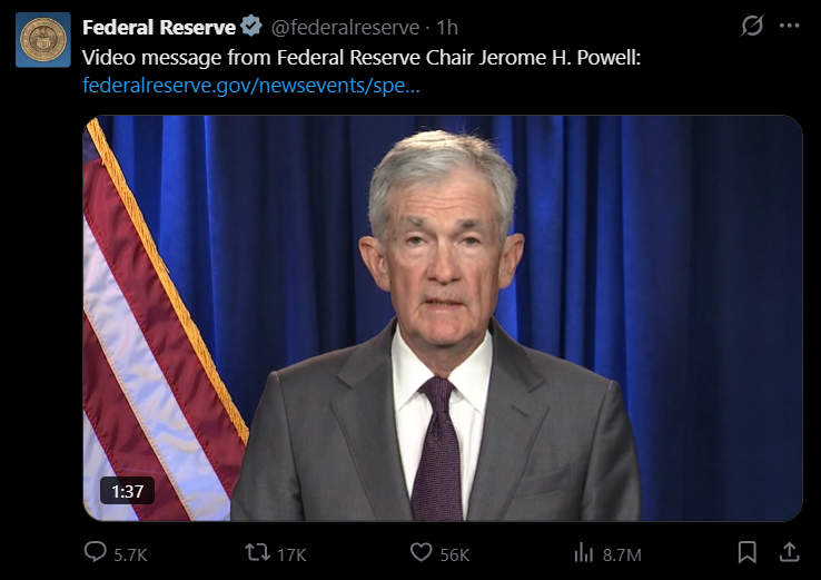 Fed đăng tải video thông báo của Chủ tịch Powell về cuộc điều tra sáng 12/1 (giờ Việt Nam)