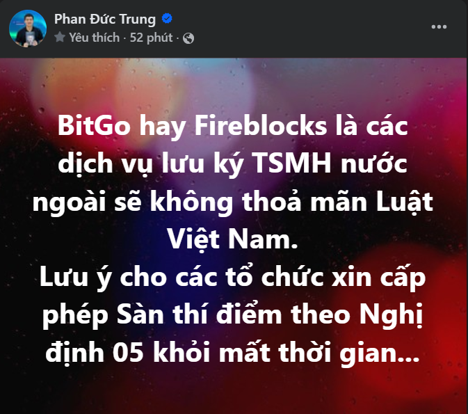 Ông Phan Đức Trung – Chủ tịch HĐQT 1Matrix kiêm Chủ tịch Hiệp hội Blockchain và Tài sản số (VBA) – cho biết, các công ty dịch vụ lưu ký tài sản mã hóa như Bitgo và Fireblocks không thỏa mãn yêu cầu pháp lý tại Việt Nam.