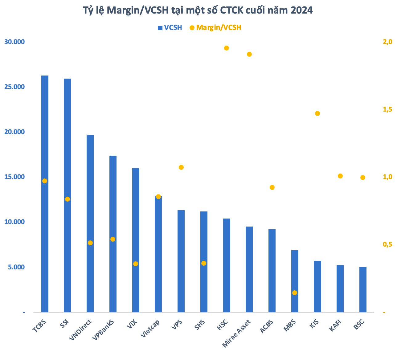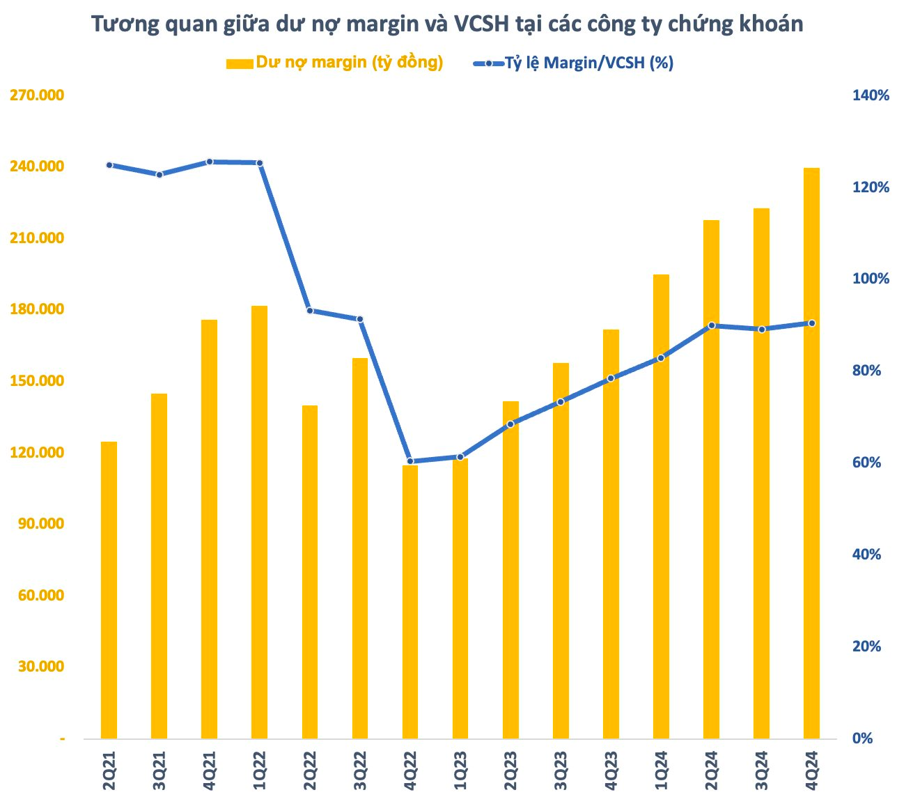 Theo thống kê, tính đến cuối năm 2024, dư nợ cho vay tại các công ty chứng khoán ước tính vào khoảng 245.000 tỷ đồng (~10 tỷ USD), tăng 13.000 tỷ so với cuối quý 3 trước đó và là mức cao kỷ lục từ trước đến nay. Trong đó, dư nợ margin ước tính khoảng 240.000 tỷ đồng, tăng 17.000 tỷ so với cuối quý 3 và cũng là con số cao nhất trong lịch sử chứng khoán Việt Nam .