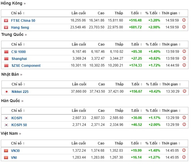 Theo đó, chứng khoán Hồng Kông dẫn đầu đà tăng, với chỉ số Hang Seng tăng mạnh 3,32% và Hang Seng Tech vọt 5,96% trong 1 tiếng cuối phiên. Trong khi đó, chỉ số CSI 300 của Trung Quốc đại lục cũng tăng 1,16%, chốt phiên ở mức 3.890,60 điểm.
