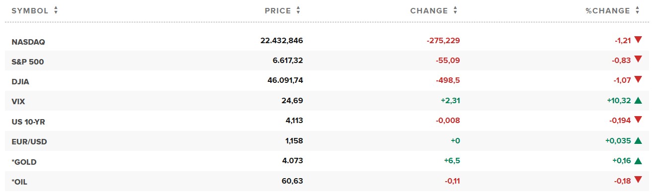 Kết phiên, chỉ số Dow Jones mất 498,5 điểm (tương đương 1,07%) còn 46.091,74 điểm. Chỉ số S&P 500 giảm 0,83% xuống 6.617,32 điểm, đánh dấu phiên giảm thứ 4 liên tiếp – chuỗi lao dốc dài nhất kể từ tháng 8 năm nay. Nasdaq Composite mất 1,21%, xuống còn 22.432,85 điểm.