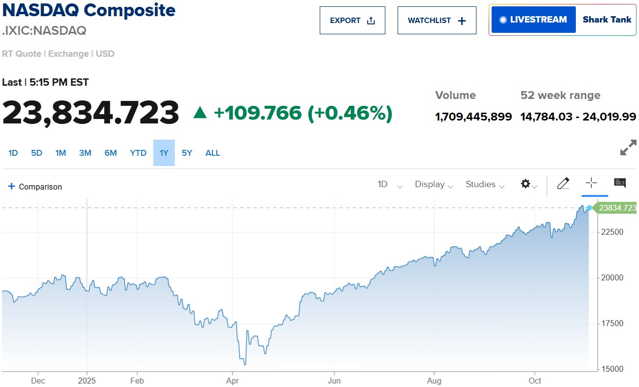 Chỉ số Nasdaq Composite tăng 0,46%, lên 23.834,72 điểm trong phiên giao dịch ngày 3/11, nhờ sự dẫn dắt của nhóm cổ phiếu công nghệ. S&P 500 nhích nhẹ 0,17% lên 6.851,97 điểm, trong khi chỉ số Dow Jones giảm 226,19 điểm, tương đương 0,48%, xuống còn 47.336,68 điểm.