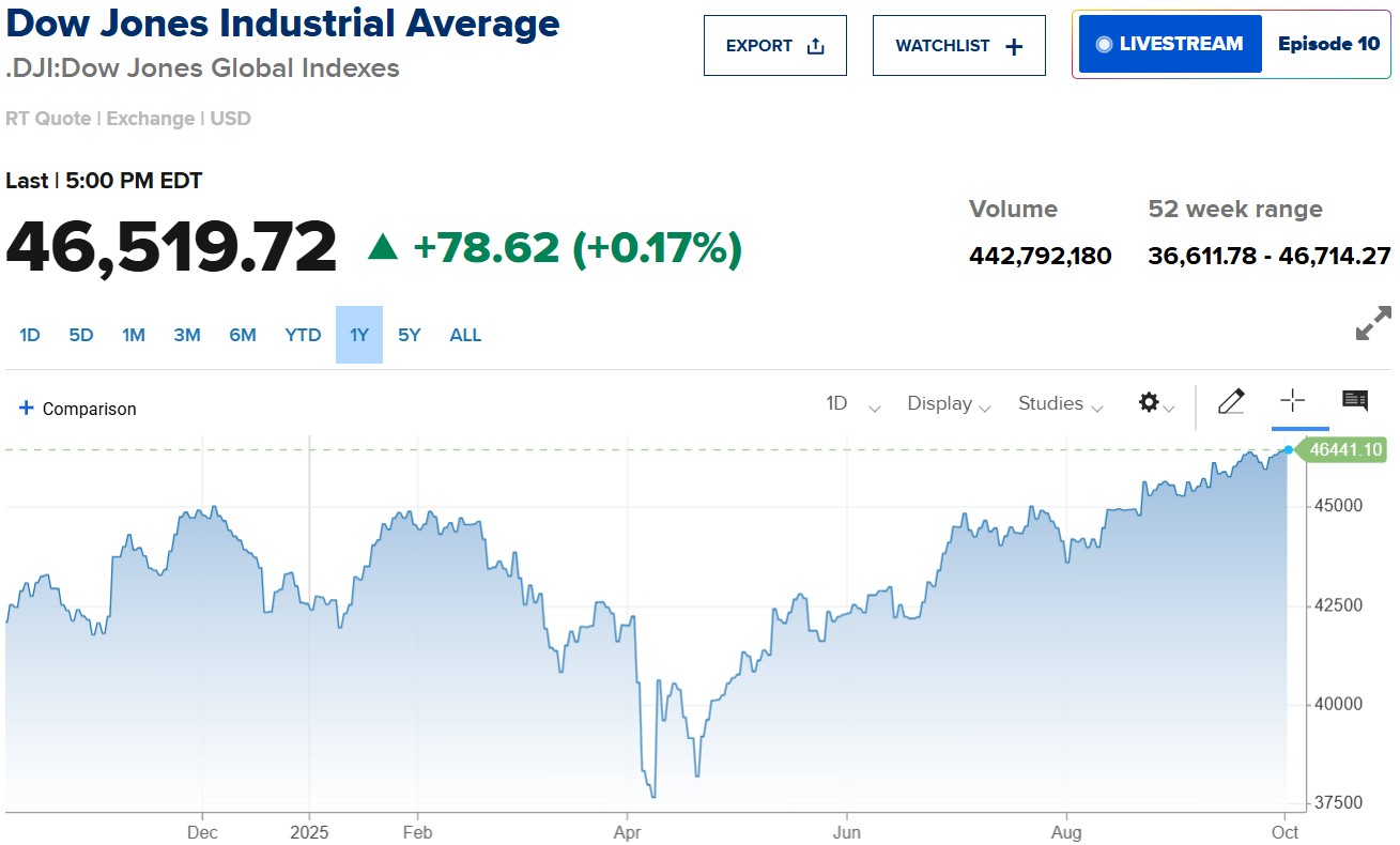 Kết phiên, chỉ số S&P 500 nhích 0,06% lên 6.715,35 điểm. Chỉ số Dow Jones tăng 78,62 điểm (tương đương 0,17%) lên 46.519,72 điểm, trong khi Nasdaq Composite cộng 0,39% lên 22.844,05 điểm. Đây cũng là mức cao kỷ lục mới của Nasdaq, nhờ lực đẩy từ cổ phiếu Nvidia.