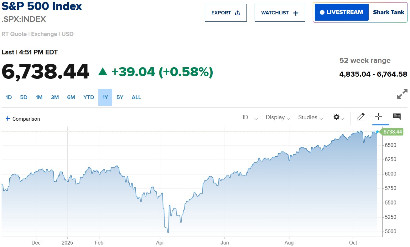 Chốt phiên, chỉ số S&P 500 tăng 0,58% lên 6.738,44 điểm, đánh dấu sự phục hồi sau phiên giảm trước đó. Dow Jones cộng thêm 144,2 điểm (tương đương 0,31%) lên 46.734,61 điểm. Nasdaq Composite tăng mạnh 0,89% lên 22.941,80 điểm, dẫn dắt bởi đà tăng của các cổ phiếu Nvidia, Broadcom và Amazon.