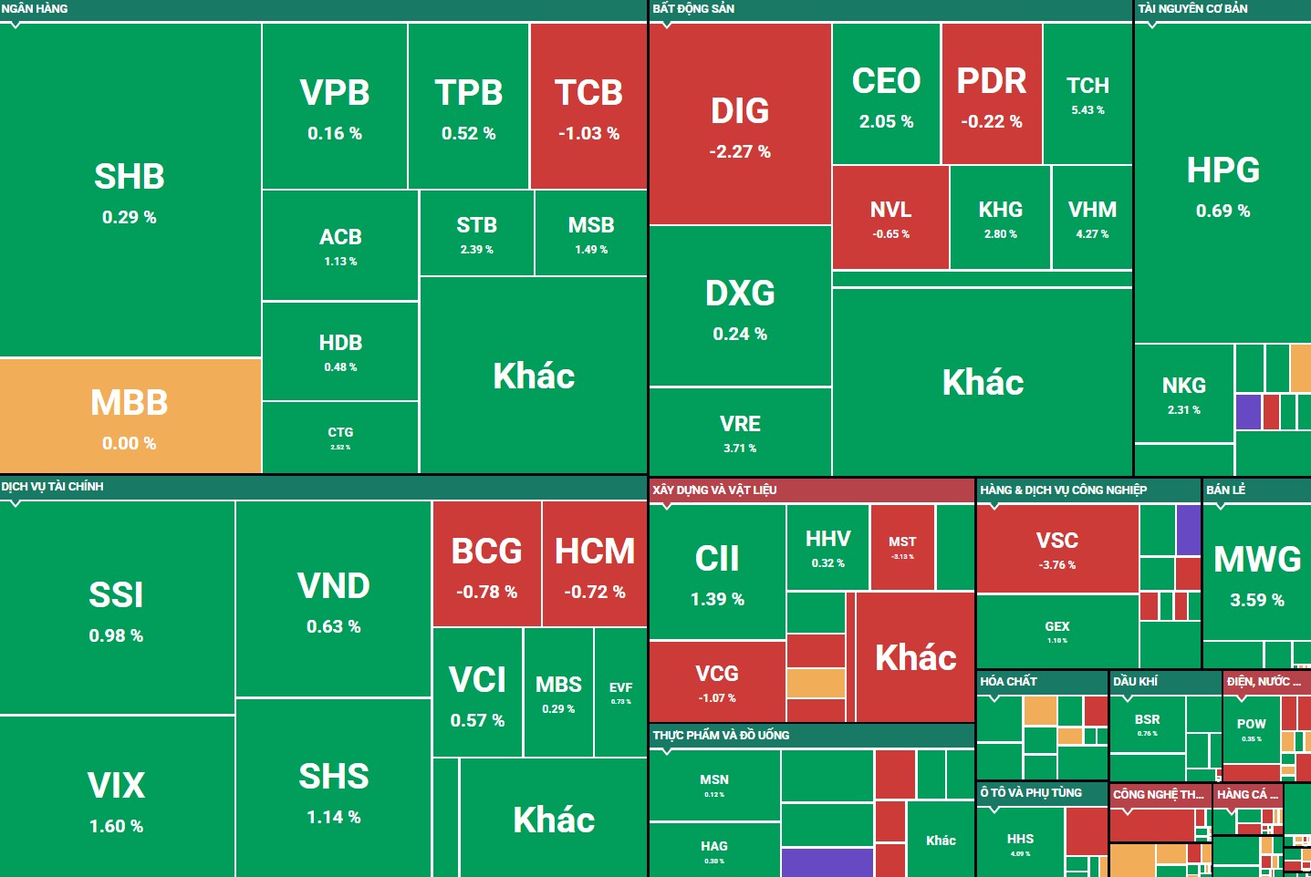 Cổ phiếu ngân hàng cũng diễn biến phân hóa, với 15 mã tăng, 8 mã giảm và 4 mã đứng giá. Trong đó, CTG tăng mạnh nhất với 2,52%, tiếp đến là STB (+2,39%), MSB (+1,49%), VCB (+1,4%). Ngược lại, một số mã ngân hàng vốn hóa lớn như BID, TCB, LPB chốt phiên trong sắc đỏ.